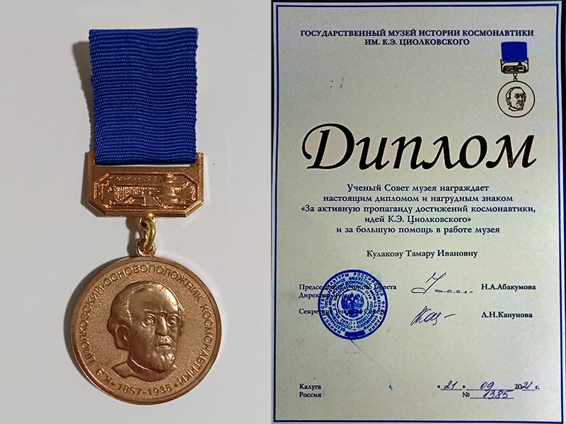 Наша коллега Тамара Кулакова получила нагрудный знак имени К.Э, Циолковского и диплом Государственного музея истории космонавтики за активную пропаганду достижений космонавтики, идей К.Э. Циолковского и за большую помощь в работе музея.