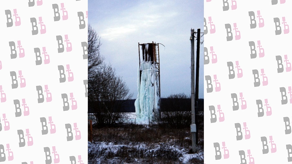А  бывают «водопады» техногенные. Вообще-то на водонапорных башнях должен быть автомат перелива, отключающий насос при заполнении бака. Когда его нет или он не работает, получается как-то так…
