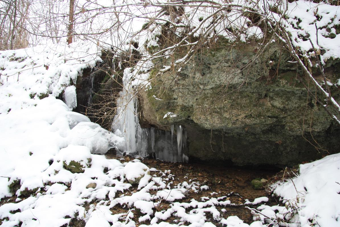 Самый «горный»  калужский водопад в овраге Любовец (Ферзиковский район) действует периодически – время от времени вода уходит в карстовое подземное русло. Соответственно и зимой он выглядит по-разному, иногда – вот так. Спрашивают о происхождении сосулек под нависающей плитой: неужели вода просачивается сквозь камень? Нет, она на нем конденсируется в легкую оттепель, когда камень холоднее воздуха.