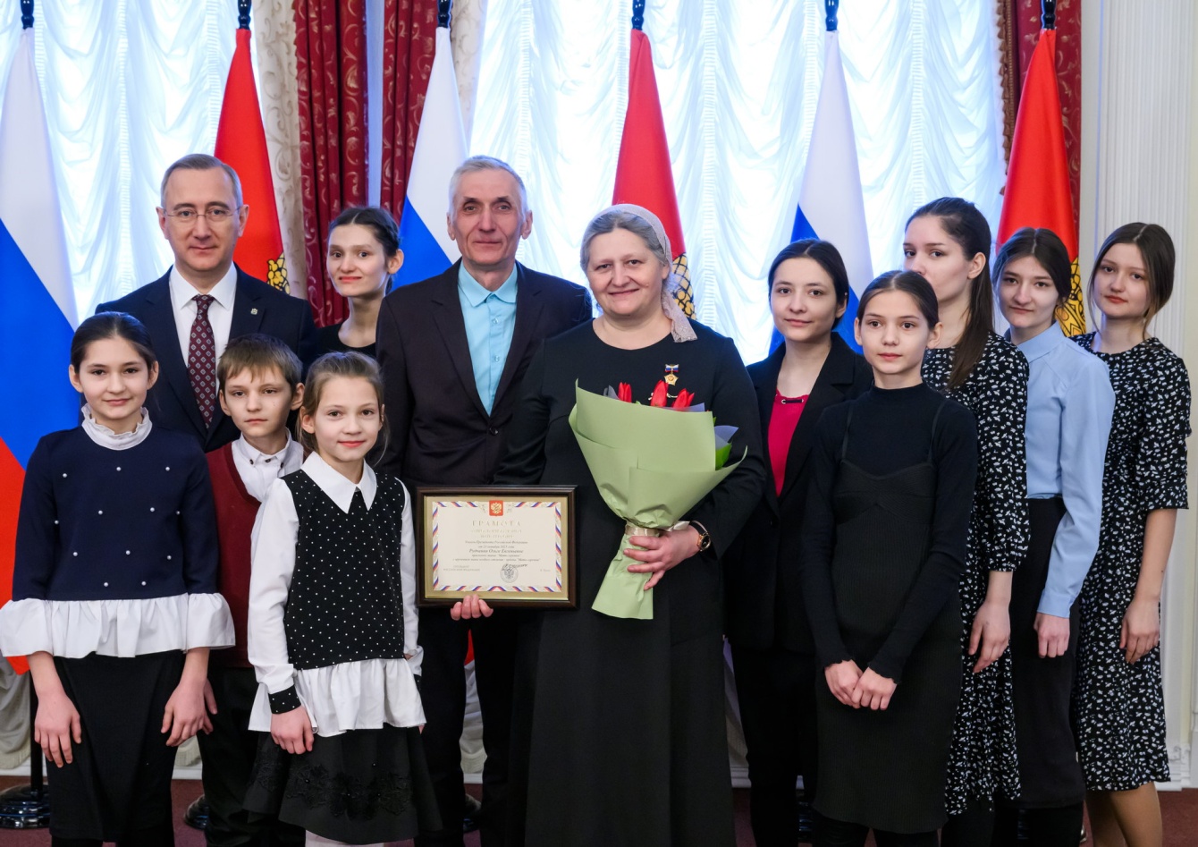 Губернатор вручил знак особого отличия - орден «Мать героиня» многодетной маме Ольге Рудченко из Жиздринского района, родившей и воспитавшей вместе с мужем 15 детей. Поздравляя ее, Владислав Шапша, подчеркнул: «Мама - это высшее и самое главное призвание женщины. Родить ребенка и дарить жизнь, хранить тепло домашнего очага очень важно. А когда женщина рожает не одного, а много детей – это каждодневный подвиг и тяжелый труд». Почетное звание «Мать-героиня» было установлено в 1944 году как высшая степень отличия для женщин, родивших и воспитавших десять и более детей. С 1991 года награду не вручали. В августе 2022 года Указом Президента Российской Федерации Владимира Путина ее возродили в России.