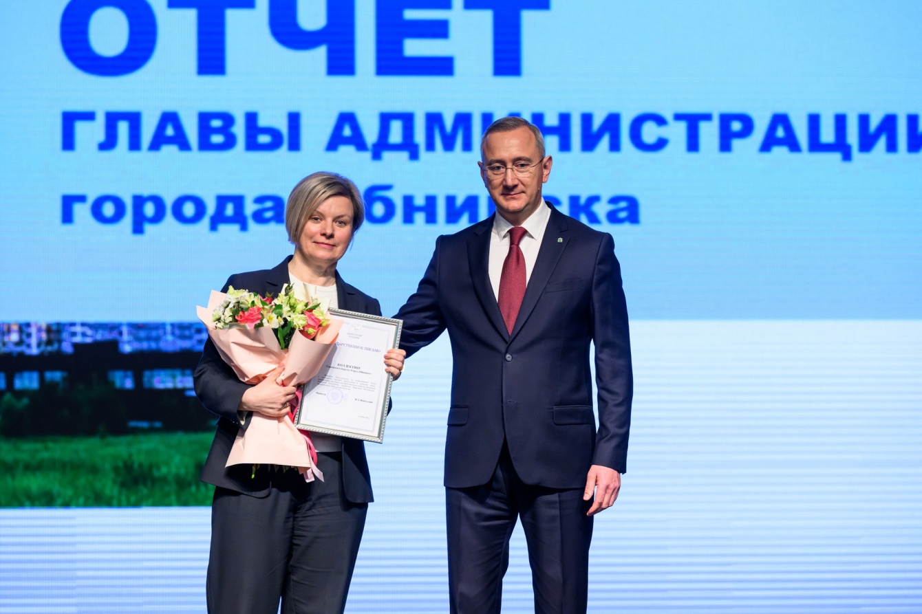 В ходе традиционной церемонии награждения Владислав Шапша передал Татьяне Леоновой Благодарственное письмо Минстроя России, адресованное коллективу администрации города Обнинска. Этой награды они удостоены за существенный вклад и достижение высоких результатов в решении задач, направленных на социально-экономическое развитие ДНР, ЛНР, Запорожской и Херсонской областей.