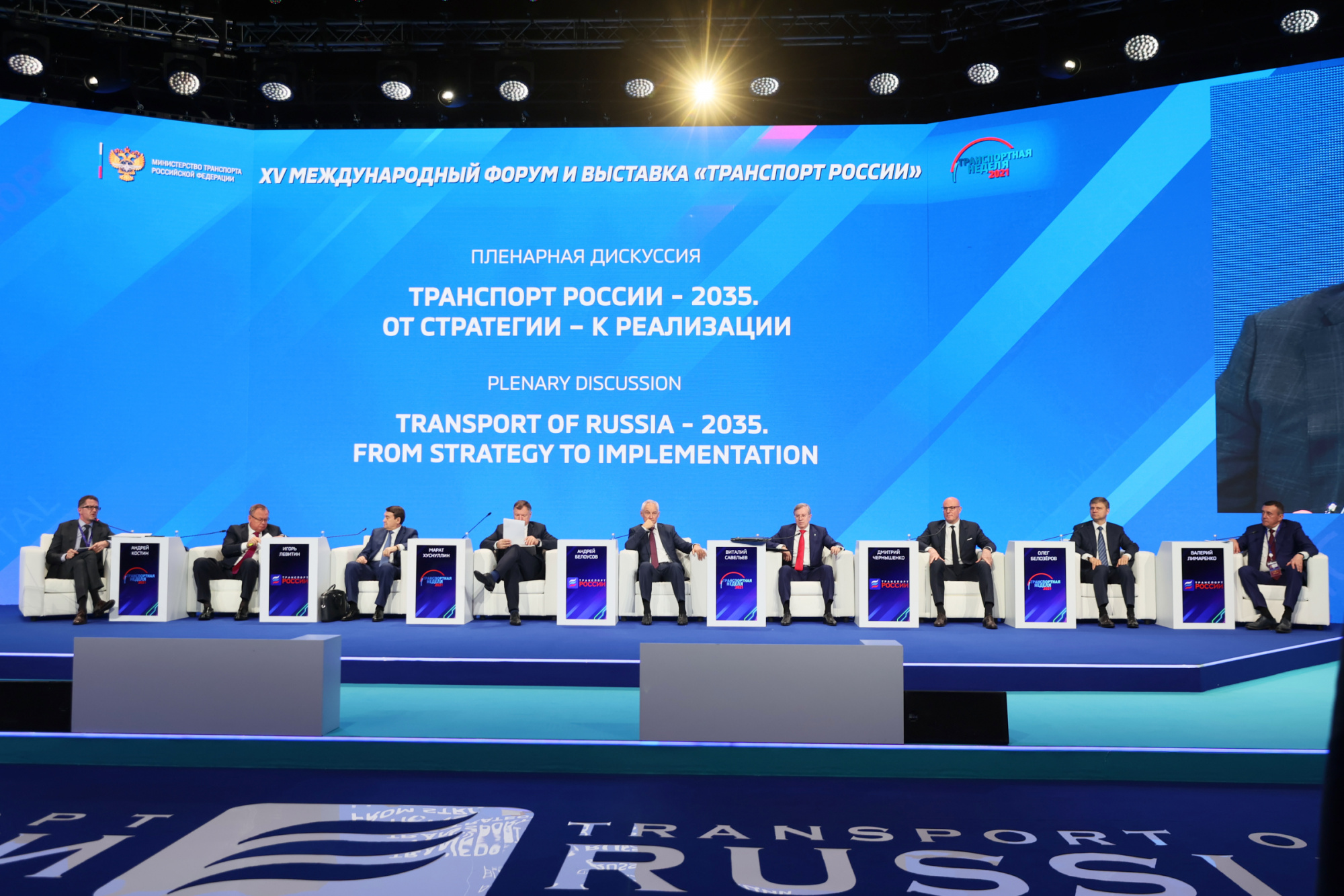 Тема пленарной дискуссии - «Транспорт России – 2035. От стратегии – к реализации». В обсуждении участвовали первый заместитель Председателя Правительства Российской Федерации Андрей Белоусов, заместитель Председателя Правительства Российской Федерации Марат Хуснуллин, заместитель Председателя Правительства Российской Федерации Дмитрий Чернышенко, министр транспорта РФ Виталий Савельев.