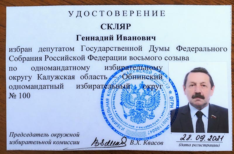 На этой неделе на заседании избирательной комиссии Калужской области уже был рассмотрен вопрос о регистрации избранного депутата Государственной Думы Федерального Собрания Российской Федерации восьмого созыва Геннадия Ивановича Скляра. Избирательная комиссия не нашла препятствий для регистрации его депутатом нижней палаты федерального парламента.