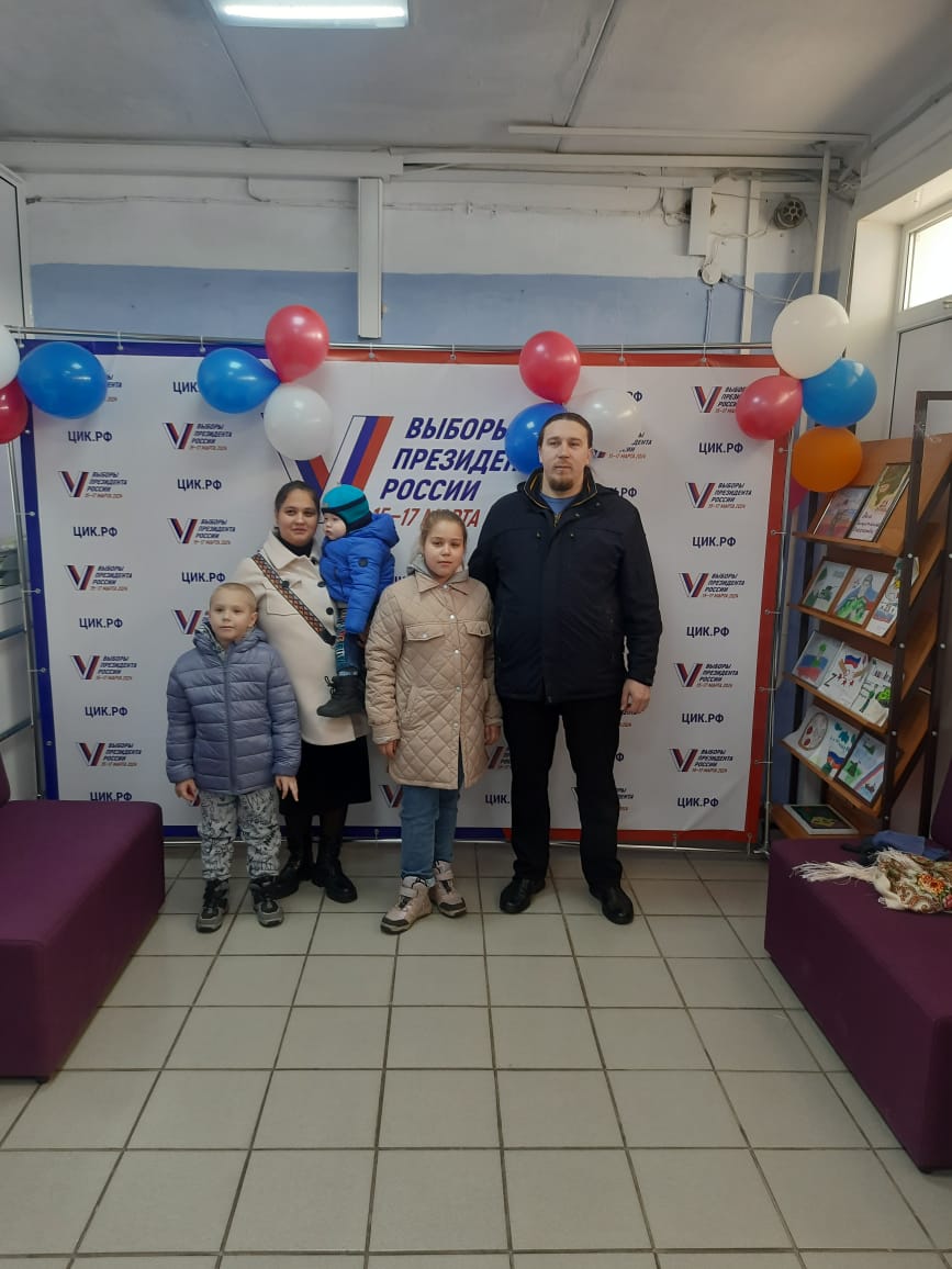 Многодетная семья Александра и Екатерины Немшиловых известна в районе своим активным участием в различных семейных и патриотических мероприятиях. Разумеется, пропустить такое важное для каждого жителя нашей страны событие, как выборы Президента России, они тоже не могли. И хотя дети еще маленькие и не достигли возраста, когда можно использовать свое избирательное право, на участок пришли всей семьей.