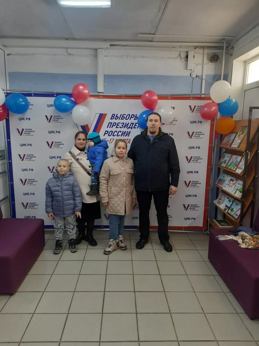 Многодетная семья Александра и Екатерины Немшиловых известна в районе своим активным участием в различных семейных и патриотических мероприятиях. Разумеется, пропустить такое важное для каждого жителя нашей страны событие, как выборы Президента России, они тоже не могли. И хотя дети еще маленькие и не достигли возраста, когда можно использовать свое избирательное право, на участок пришли всей семьей.