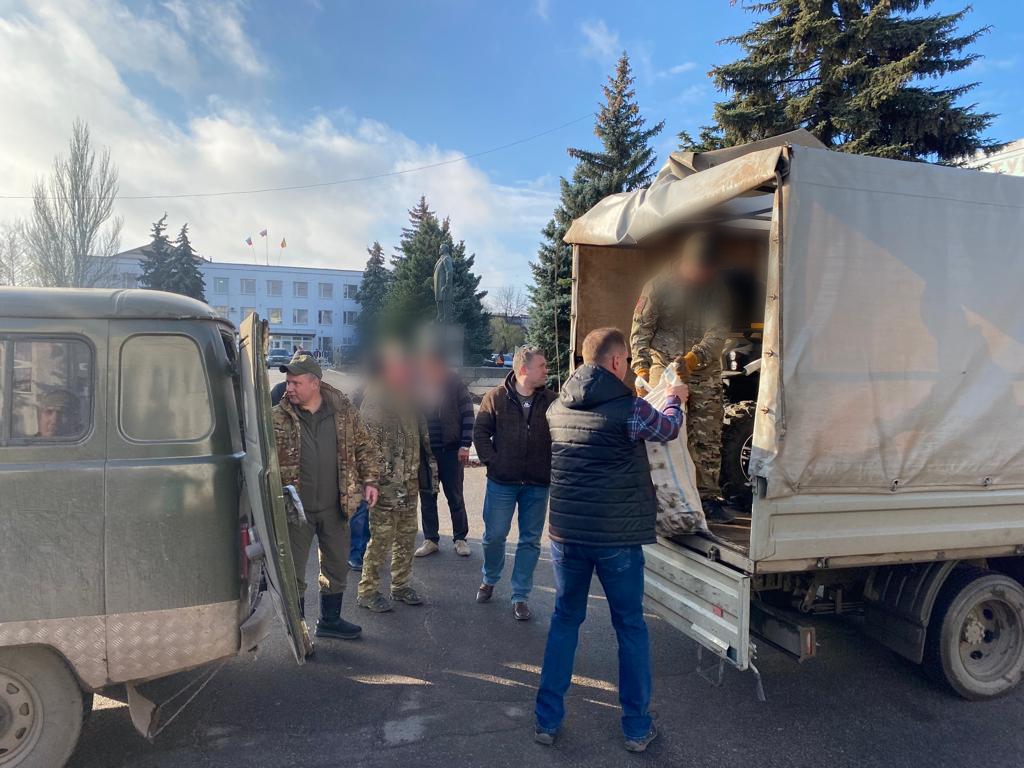 Владимир Козлов, Михаил Голубев и Алексей Волков передают гуманитарную помощь землякам-артиллеристам.