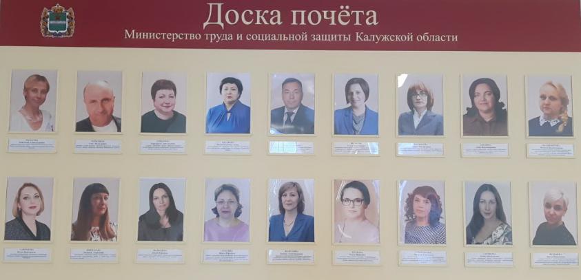 18 работников министерства, учреждений социального обслуживания населения, центров занятости населения, внесших значительный вклад в развитие социальной сферы региона, решение задач в области труда и занятости населения Калужской области, удостоились чести быть представленными на Доске почета.