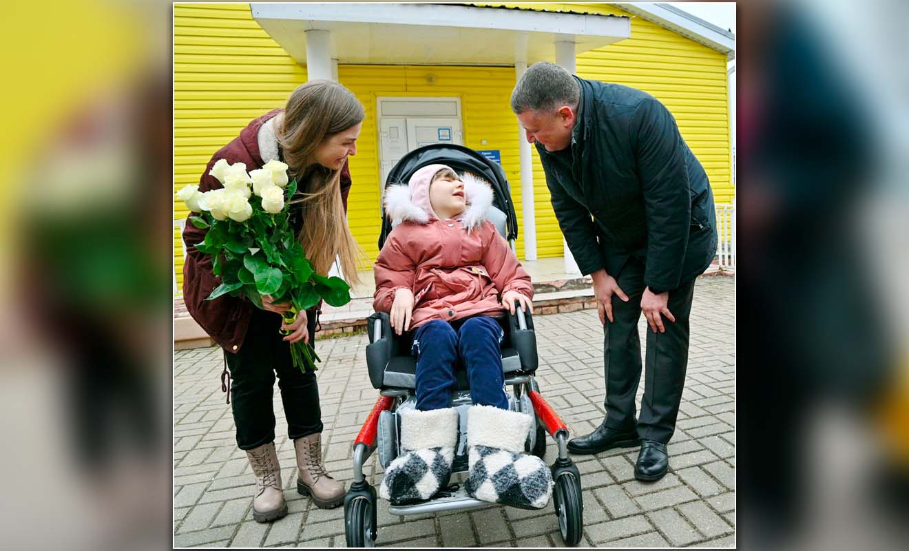 Предприниматель и депутат областного Заксобрания Сослан ТАКАЕВ наклоняется к Софии, берет девочку за руку:
