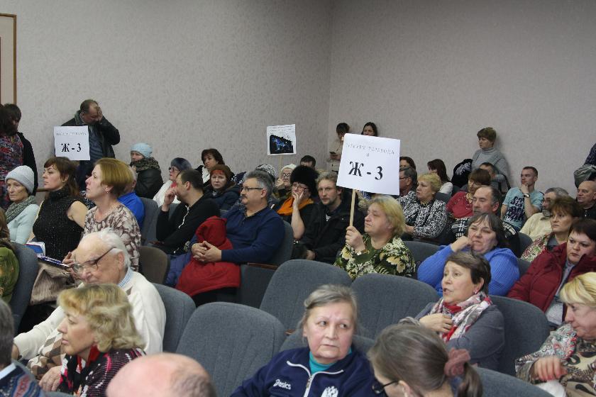После официальной части публичных слушаний начались выступления тех, кто для этого предварительно записался. В зале поднялись плакаты с интересными надписями: «Требуем перевода в Ж-3». Это позиция в основном жителей брусчатых двухэтажок. Дело в том, что их переселение длится уже почти 15 лет, а темпы этого процесса такие, что некоторые могут так и не увидеть новой квартиры.