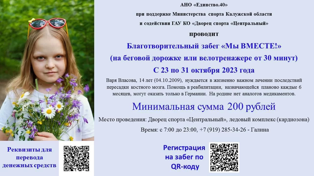 С 23 по 21 октября во Дворце спорта «Центральный» состоится благотворительный забег #МыВместе в помощь Варе Власовой. Об этом сообщает министерство спорта Калужской области. В 2010 году девочке диагностировали острый лимфбласный лейкоз. Ей провели успешную операцию, однако восстановление все еще продолжается.