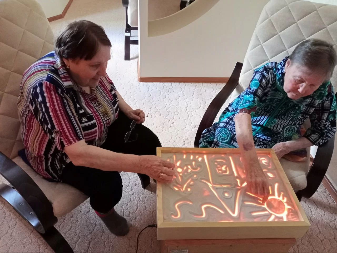 Песок позволяет пожилым людям на занятии со специалистом выразить эмоции, снять напряжение, а также проявить творческие способности. При работе с ним движения становятся размеренными, синхронизируются с ритмом дыхания.