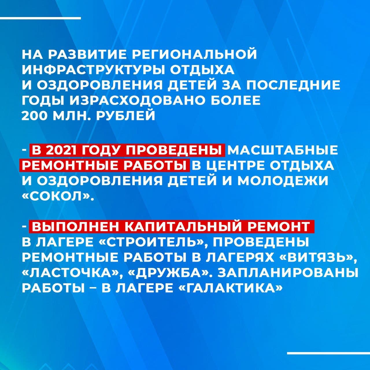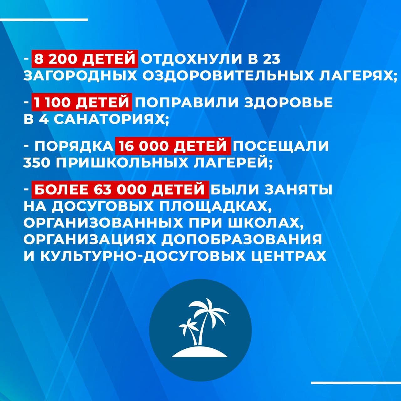 «Порядка 26 тысяч детей отдохнули в загородных оздоровительных лагерях, лагерях дневного пребывания, в организациях санаторного типа. А всего летний отдых, оздоровление и занятость были организованы для более 89 000 детей, включая занятия на досуговых площадках, организованных при школах, учреждениях допобразования, культурно-досуговых центрах».