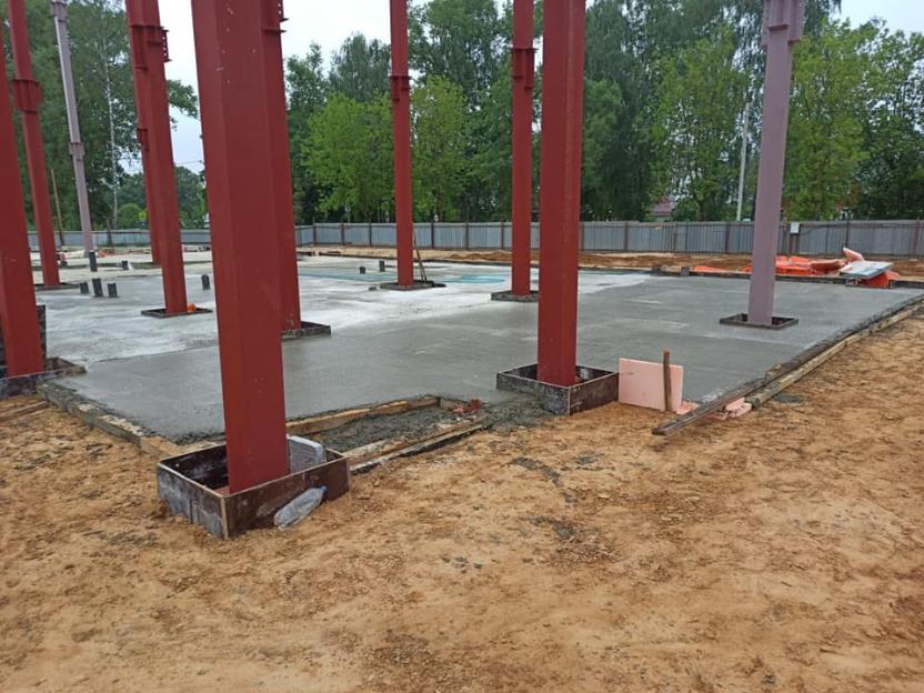 Уже заложен фундамент под холодильную установку, сейчас строители заливают полы на административно - бытовом комплексе. Параллельно с этим начались работы по установке ограждения катка. Для благоустройства территории завезли тротуарную плитку и бордюрный камень.
