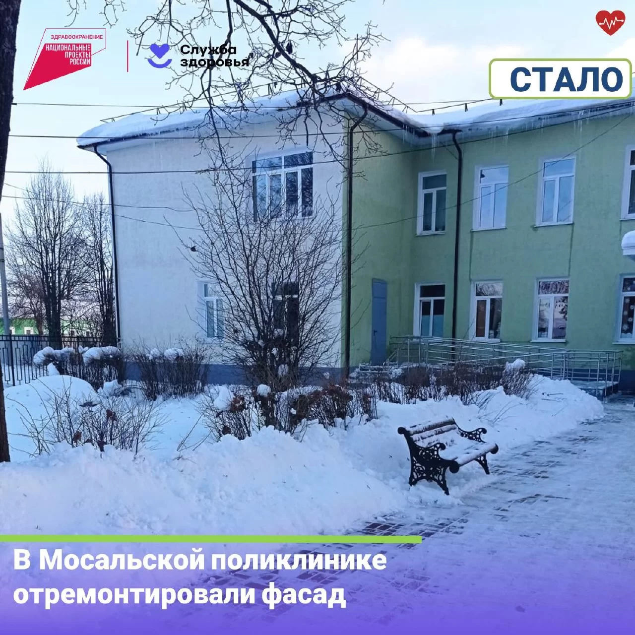 В поликлинике обновили входную группу и установили новые пандусы для маломобильных граждан. В будущем планируется провести ремонт внутренних помещений.