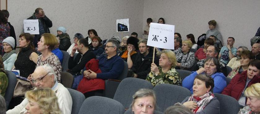 После официальной части публичных слушаний начались выступления тех, кто для этого предварительно записался. В зале поднялись плакаты с интересными надписями: «Требуем перевода в Ж-3». Это позиция в основном жителей брусчатых двухэтажек. Дело в том, что их переселение длится уже почти 15 лет, а темпы этого процесса такие, что некоторые могут так и не увидеть новой квартиры.