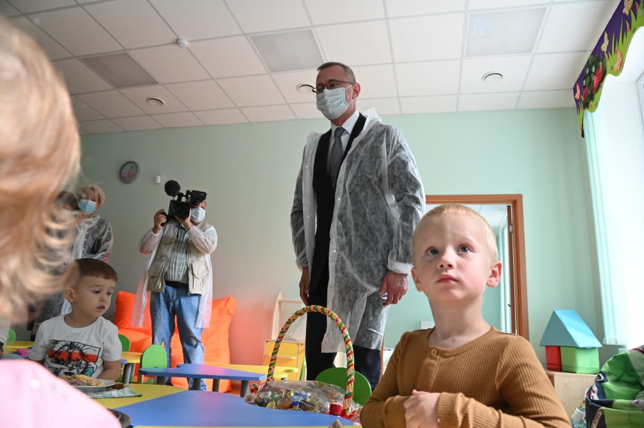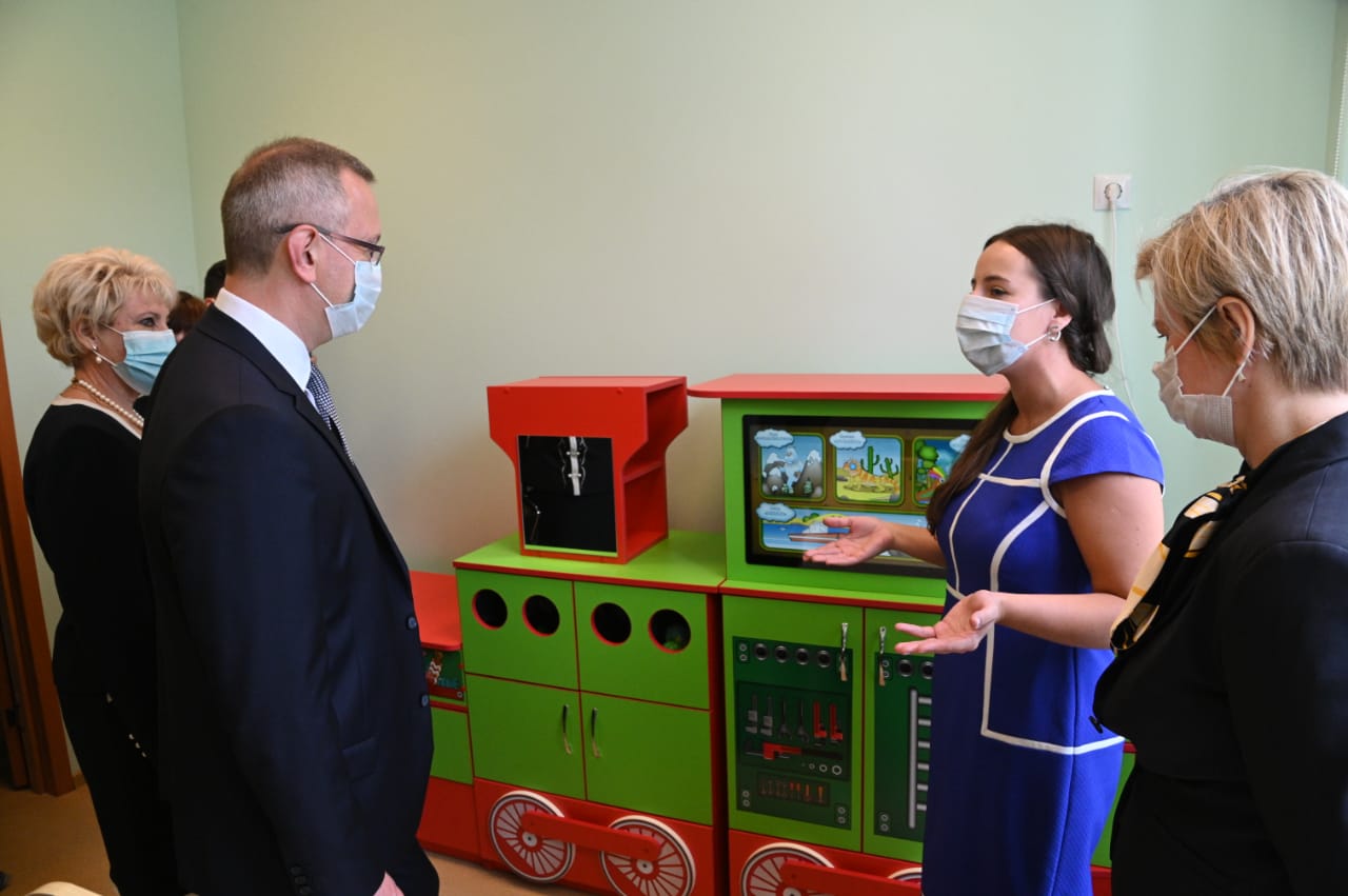 Губернатор побывал в помещении ясельной группы, осмотрел пищеблок, спортивный и музыкальный залы, познакомился с инновационным интерактивным оборудованием. Кабинет для логопедических занятий оснащен интерактивным комплексом «Логопаровозик».