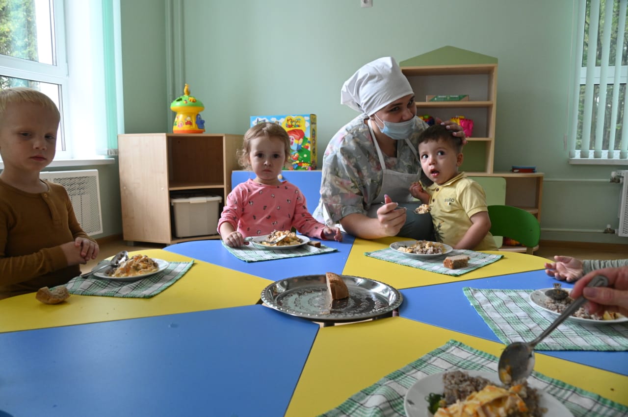 «У малышей из детского сада «Чебурашка» сегодня на обед фасолевый суп и бефстроганов с гречкой. И конечно, компот. Новое здание садика открыли вчера. Пока детки проходят адаптацию»