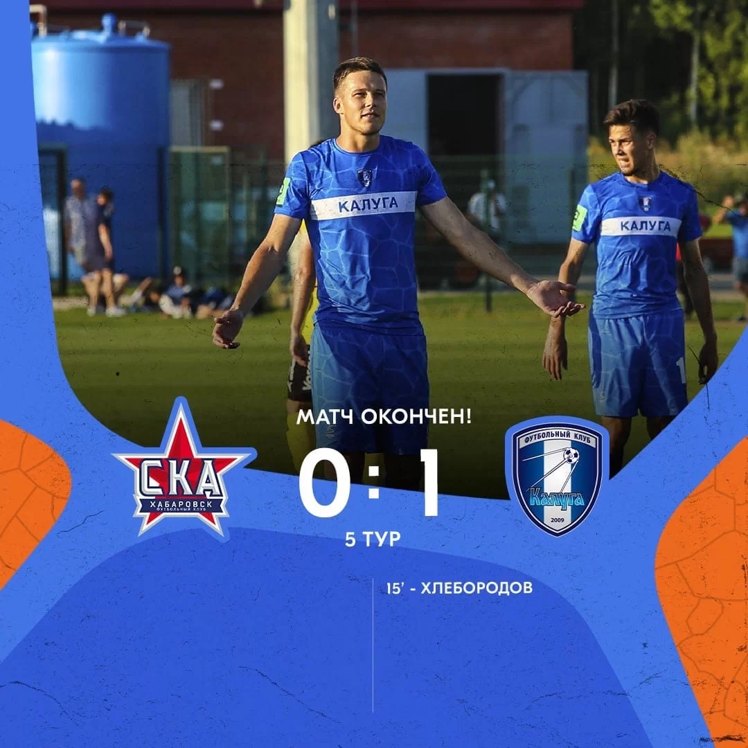 В среду, 10 августа, завершился футбольный матч мед\жду футболистами из калуги и Хабаровска. Калужане с минимальным счетом обыграли соперников с результатом 0-1. Единственный мяч на 15-й минуте первого тайма забил Хлебородов.
