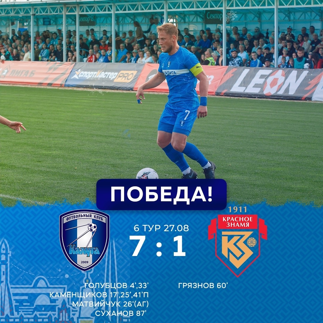 В воскресенье, 27 августа, завершился матч 6-го тура второй лиги «Калуга» - «Знамя». Судьба поединка решилась уже в первом тайме. Хет-трик Каменщикова, дубль Голубцова и автогол Матвийчука сделали счет 6:0 в пользу калужан.