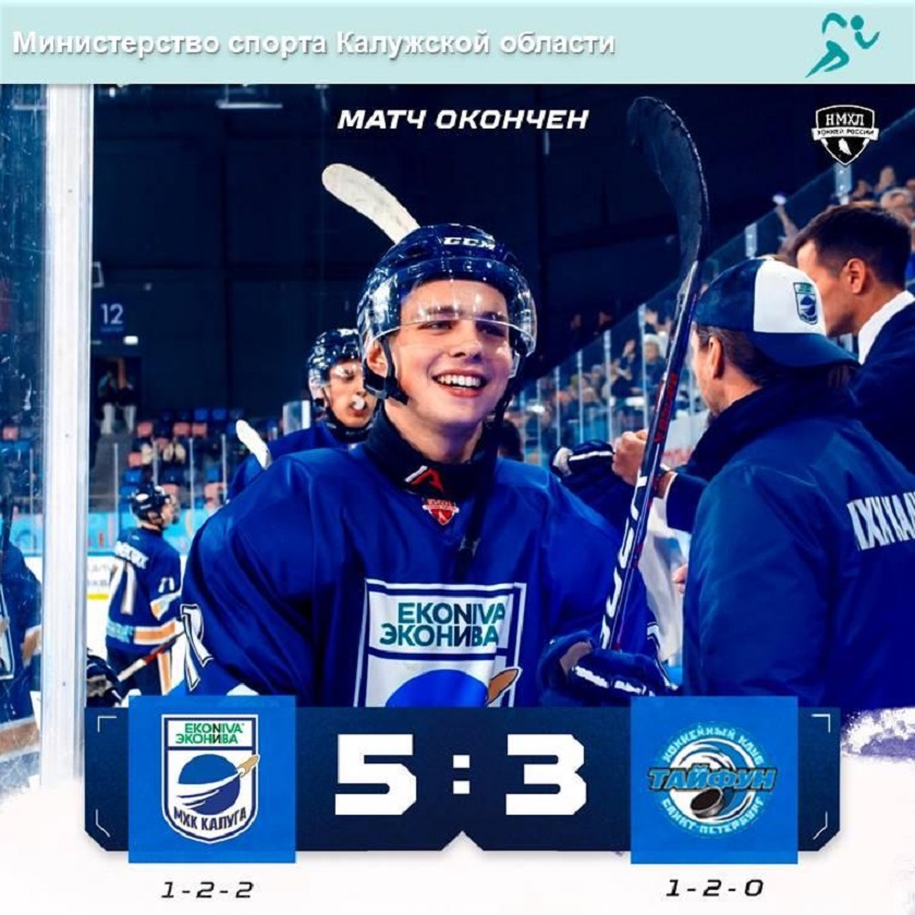 Счет на шестой минуте матча открыл Захар Хохлов. Соперники не стали отставать и на первый перерыв хоккеисты ушли со счетом 1:1. Второй период также стартовал с шайбы калужан, после чего команда укрепила свое преимущество. Одну шайбу гостям удалось отыграть, а затем и вторую. В третьем периоде счет на табло был равным, но калужане успели забить две безответные шайбы. Таким образом ХК «Калуга» закончил встречу со счетом 5:3.