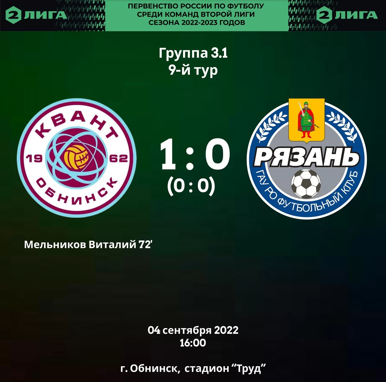 В воскресенье, 4 сентября, на стадионе «Труд» в Обнинске местный «Квант» принимал ФК «Рязань». Счёт был открыт лишь во втором тайме благодаря удару Мельникова. Этот результат сохранился до конца игры и принес обнинцам долгожданную победу.