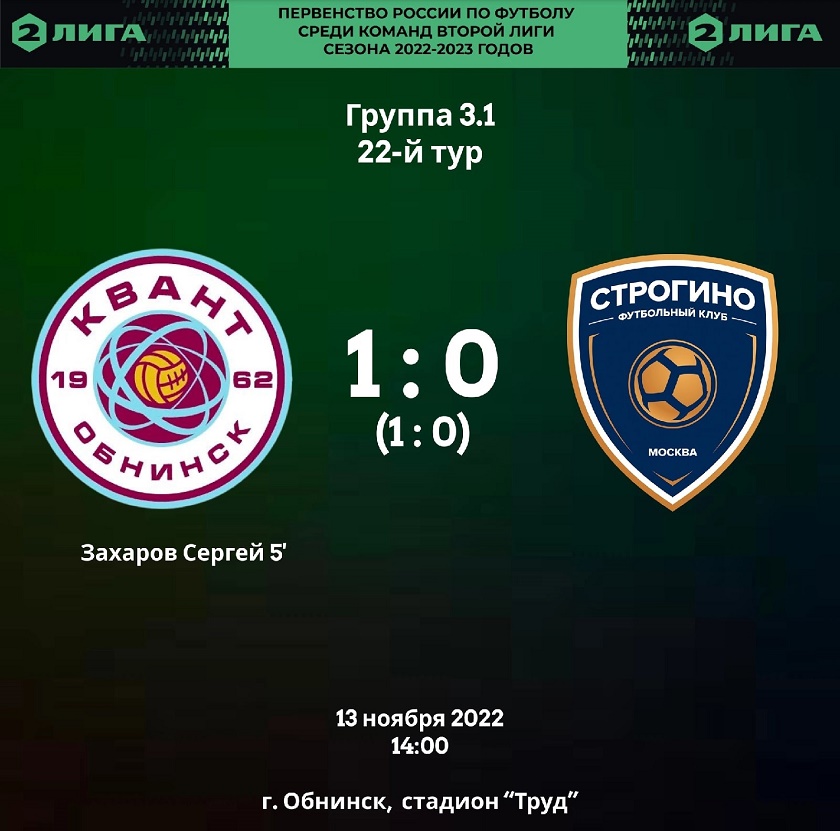 Обнинский «Квант» встречался с футбольным клубом «Строгино» из Москвы. По итогам игры наши земляки победили со счетом 1:0 и одержали свою третью победу.
