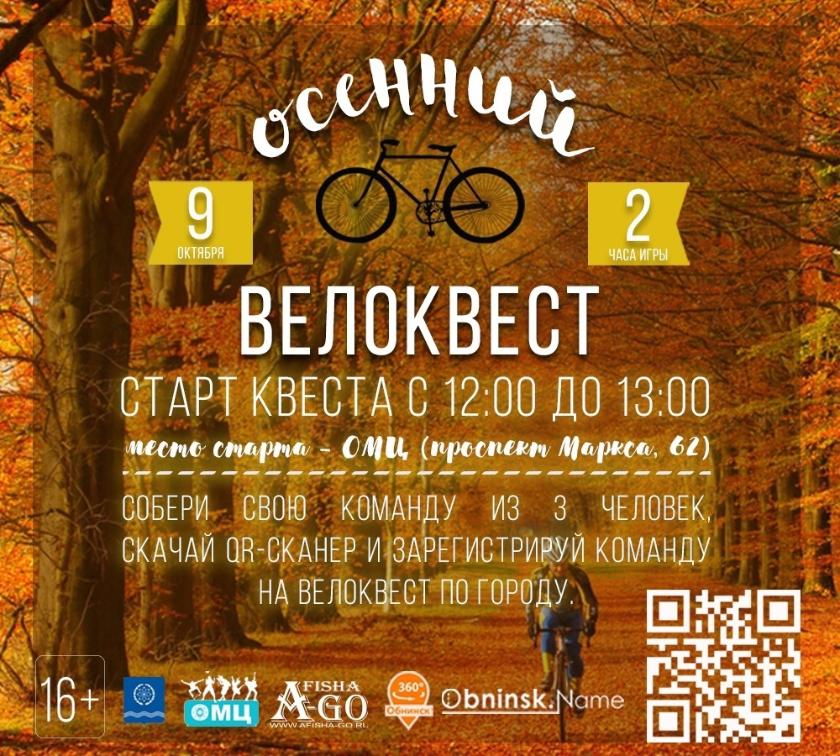 Осенний велоквест стартует от Обнинского молодежного центра — от дома №62 по проспекту Маркса в период с 12.00 до 13.00. Игра рассчитана приблизительно на 2 часа, она закончится для всех команд в 17.00, самые быстрые будут награждены призами.