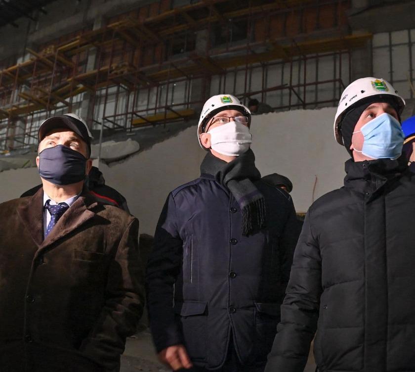 В настоящее время монтажные и отделочные работы продолжаются во всех зданиях будущего Дворца спорта, к ним подключено отопление. В здании ледовой арены утепляются стены, ведутся отделочные работы на трибунах. По словам представителей подрядной организации, с завтрашнего дня здесь «начинают готовить основание под устройство «пирога» холодной плиты: он будет состоять из слоя песка, слоя утеплителя, змеевика и верхних слоев. С завтрашнего рабочие приступят к этой работе». Главу региона интересовали вопросы завершения работ по устройству вентиляции в здании ледовой арены, отделки стен. По информации руководители подрядной организации, до конца месяца эти работы будут завершены.